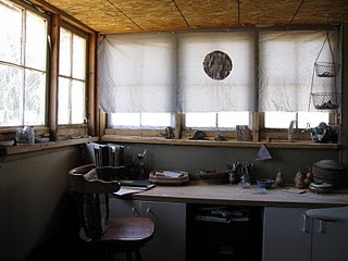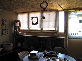 kaite..like everything here, thisROOM is …. well, what. ThisROOM wasnt and then was. it wasa screened in back porch untili guess 3 years? ago, no, 4. myhouse is an old rickety trailer.my daughter and i did a What if/Why not and borrowed a sawzall tocut out a 14ft chunk of the wallto create the ROOM. neither of usreally having any idea what we weredoing. I wanted to leave the plain2x4 ceiling but that was REALLYimpractical heat wise (i heat witha wood stove) so we put the pressedboard. I like the pattern of itbetter than plywood. There wastalk of ways to finish it, but inever seem to find it a priority.the windows i scavanged from aneighbor who might be called ahoarder. REALLY impractical, oldold wood frames, nothing really issquare at all so i just keep addingquarter round molding and caulkingtrying to plug up the cracks. anyway…to me, it was a miracle.14x10ft ROOM to work in. andwindows windows windows.yes…more woven cloth, in a looongstrip. 2 of them.