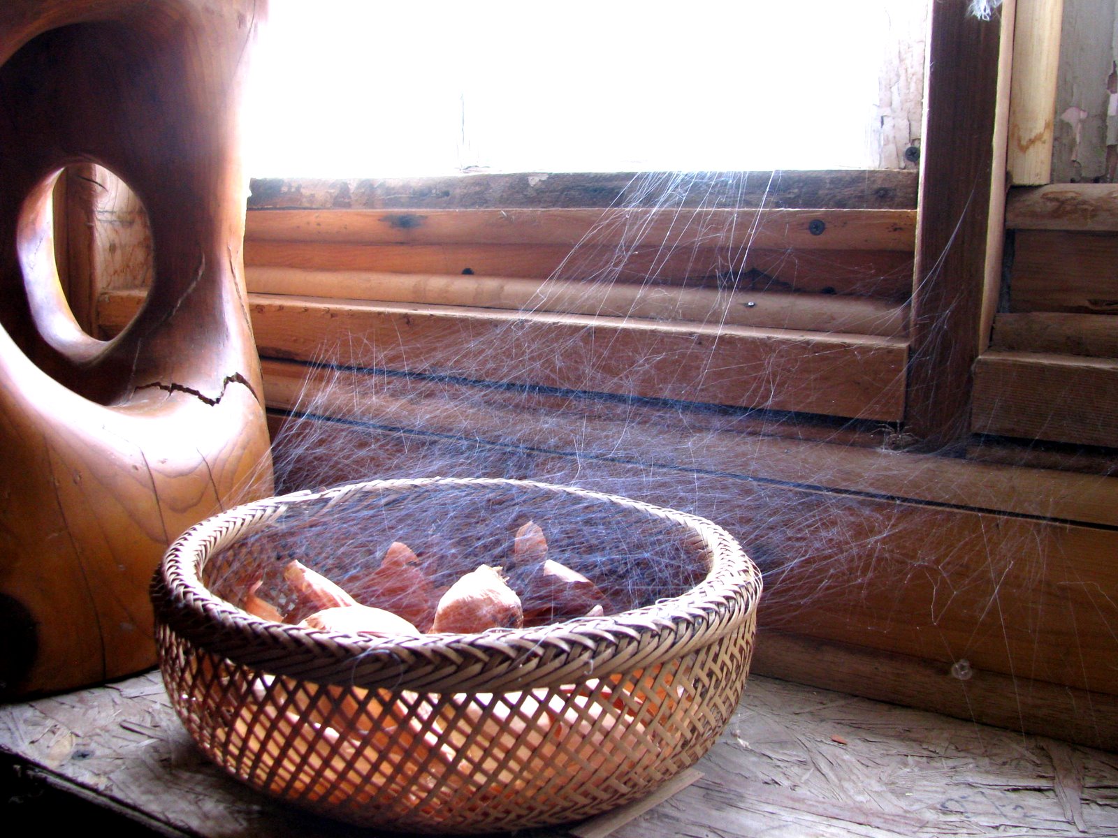 yesterday, when i wanted to pin up the South cutout window cloth, i had to first vacuum up a web. i made this intention known by banging on the wood all around. then vacuumed then pinned up the cloth. just now, i noticed that during the night, there was a different intention/determination. this time not up in the corner, but down and across the basket of onion skins. you can see her on the right at the bottom of the vertical board. she has jude's magic thread legs…of course.