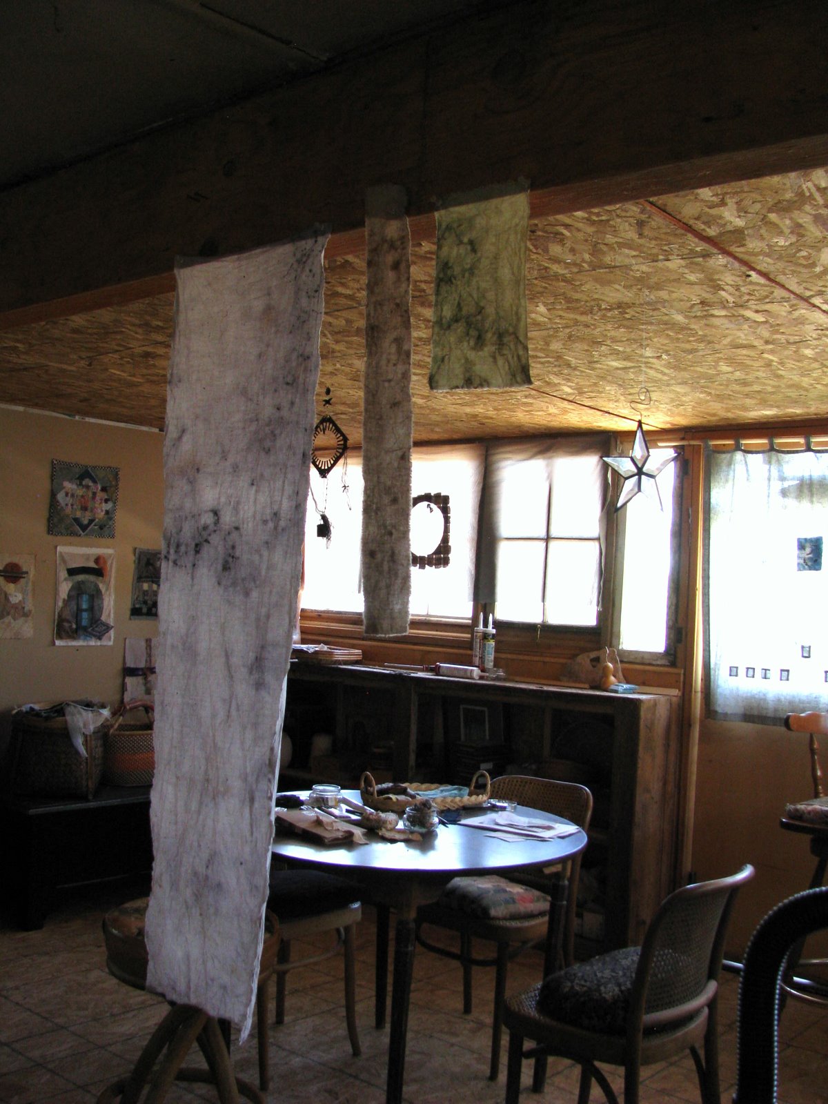 hanging from the beam are 3 pieces of cloth that i'd stuck in jars with various stuff. they look like