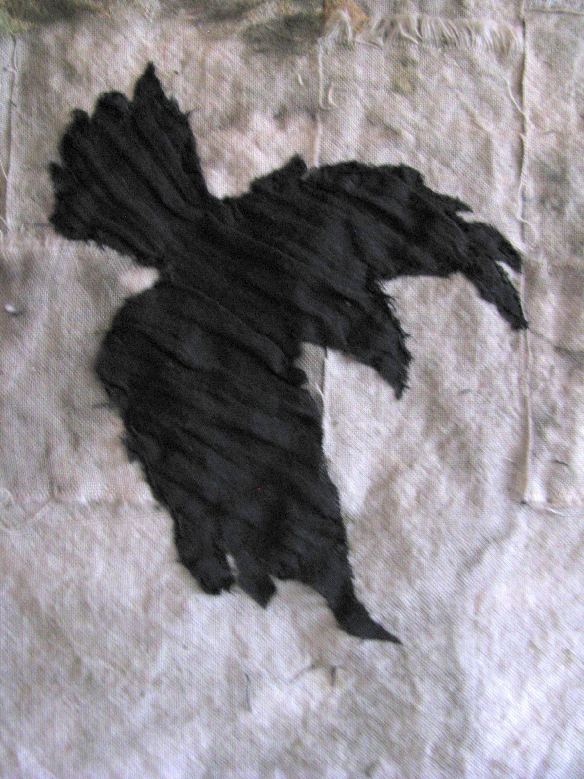 Thanks for the close-up on the raven, Grace. I love the rippled texture of the fabric you chose – perfect – and the wispy edges of the wings.I think that tiny figure holds so much weight because she is so small. It is the size difference between the figures that really speaks to me on this. I think you have illustrated what you described perfectly – the endless sky and all that is above. We are so so small. This is a very beautiful cloth, Grace.
