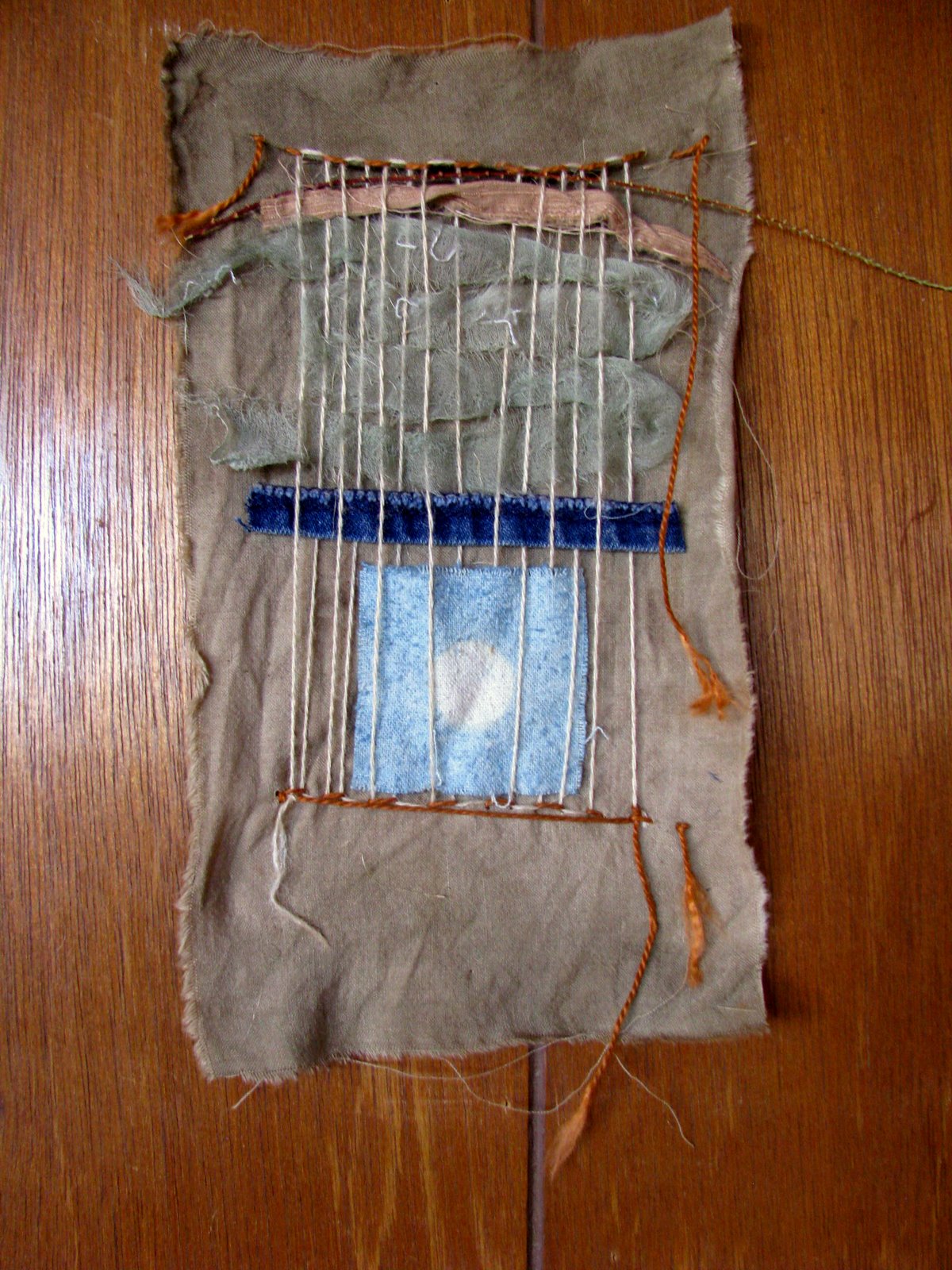 i had a thought – what if you brought those long warp strings out from the cloth – like extra loooong stitches, warp stitches? k.